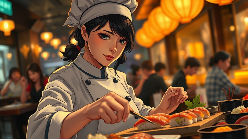 Portrait of a female chef skillfully crafting sushi at a bustling night-time restaurant, inspired by the style of Lois van Baarle with an anime touch. Her expression is focused and serene, reflecting her passion for culinary art. The ambiance is lively, with warm lighting casting gentle shadows. The scene captures the intricate details of sushi preparation, from the delicate slicing of fish to the careful arrangement of ingredients. The background subtly suggests the busy atmosphere of the restaurant, with patrons enjoying their meals in soft focus. Despite the complexity, her hands are portrayed with precision, showcasing her expertise. The image, though inspired by the anime style, maintains a high level of realism and artistic quality, free from common distortions and distractions.