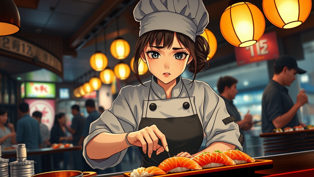 Portrait of a female chef skillfully preparing sushi in a bustling restaurant at night. The scene is reminiscent of an anime style by Lois van Baarle, capturing the vibrant energy and artistry of Japanese cuisine. Her focused expression and graceful movements are highlighted under the dim restaurant lights, creating an intimate and lively atmosphere. Despite the low resolution and occasional jpeg artifacts, her passion for her craft shines through. The setting buzzes with the chatter of patrons and the rhythmic sounds of sushi being made, while her uniform is stained from a long night of work. There are hints of artistic imperfections like slightly exaggerated anatomy and whimsical feature placements that add to the charm of the anime influence, without veering into the disturbing or grotesque. The chef stands as a dedicated artist in her domain, immersed in the culinary world and unyielding in her pursuit of perfection.