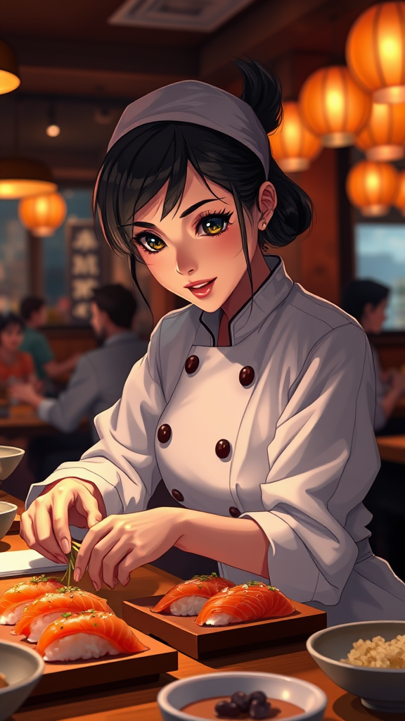 Portrait of a female chef skillfully preparing sushi in a bustling restaurant during the evening, inspired by the style of Lois van Baarle, with subtle anime influences. The scene captures the vibrant energy and precision of her work, highlighting her focused expression and deft hands as she expertly assembles delicate sushi pieces. Soft ambient lighting casts a warm glow over the cozy interior, emphasizing the intricate details and textures of the ingredients. The background includes blurred silhouettes of patrons enjoying their meals. The artwork gracefully avoids unnecessary elements like extra limbs or distortions, maintaining an engaging and polished composition.