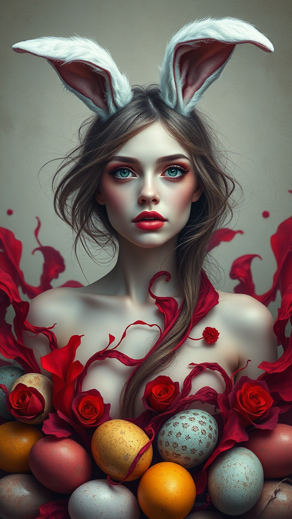 Portrait of a female figure with bunny ears and features, surrounded by vibrantly colored eggs, elements of red and deep crimson flowing across her body, merging the whimsical with an intense, mysterious aura.