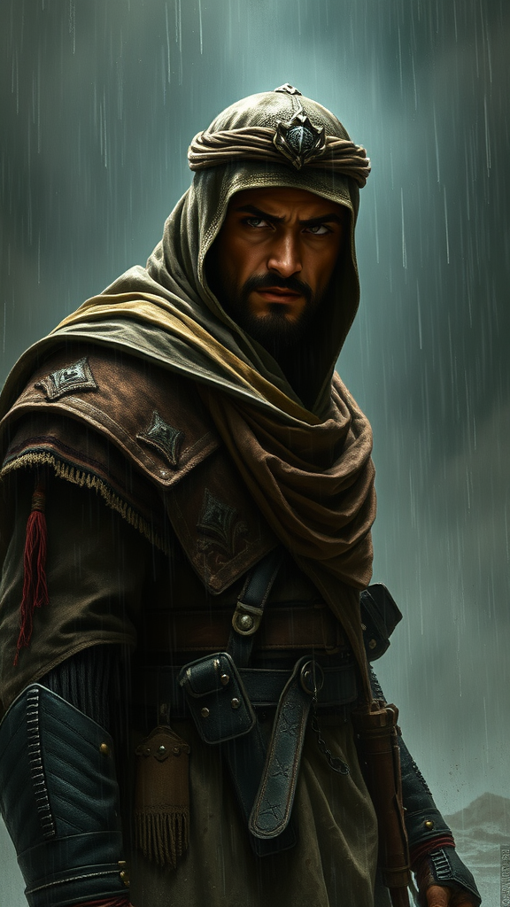 Portrait of a fierce Arab warrior standing in the rain, set against a dramatic and epic backdrop, evoking deep emotion and an ancient, mythical atmosphere, inspired by Symbaroum's dark fantasy aesthetic. The digital painting blends the styles of Martin Grip, Gustaf Ekelund, Jakub Rozalski, Bernie Wrightson, and Frank Frazetta, incorporating richly detailed textures and a moody, atmospheric color palette with subtle variations to convey the warrior's intense gaze and powerful presence amidst the storm.