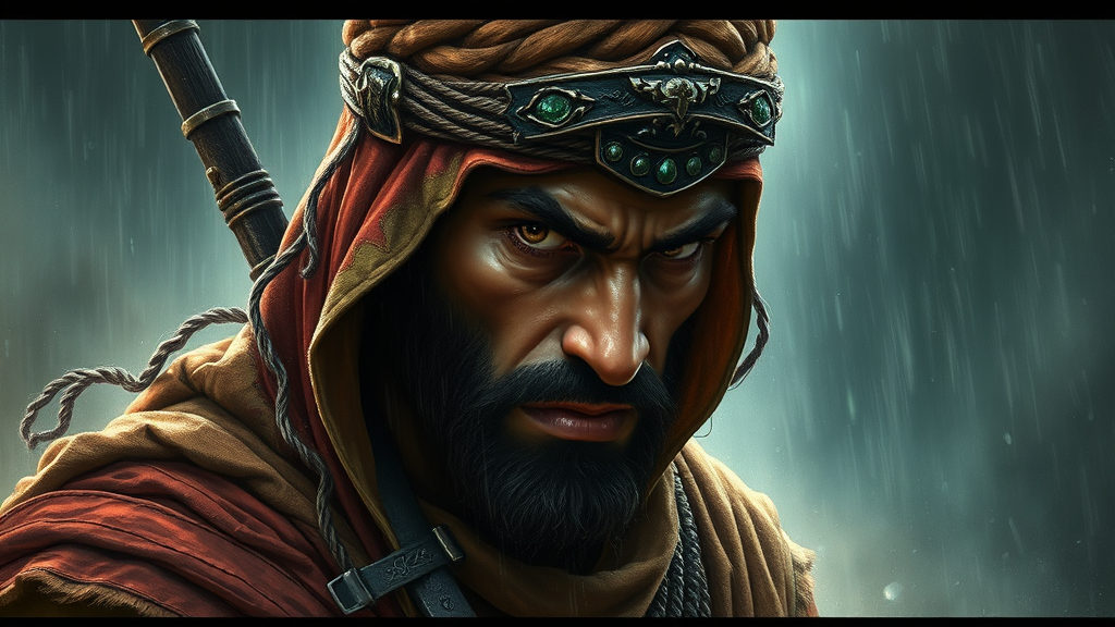 Portrait of a fierce Arabian warrior, enveloped in a rain-drenched, epic scene, with an emotionally intense ambiance, captured in a style reminiscent of Symbaroum. The digital painting reflects influences from legendary artists like Martin Grip, Gustaf Ekelund, Jakub Rozalski, Bernie Wrightson, and Frank Frazetta, incorporating subtle touches of mysterious shadows and intricate detailing while retaining the core essence of a noble yet savage fighter.