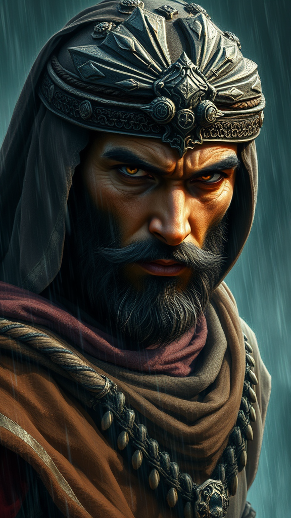 Portrait of a fierce Arabian warrior in a torrential rain, evoking an epic and emotionally profound scene. The warrior's intense gaze reflects an ancient wisdom, with intricate armor and flowing robes capturing the wild, untamed spirit of a bygone era. The digital painting blends the dark, atmospheric style of Martin Grip with the dramatic flair of Frank Frazetta, incorporating Jakub Rozalski's vivid landscapes and Bernie Wrightson's meticulous texturing. The composition teems with life, as Gustaf Ekelund's skillful use of light and shadow highlights the warrior's resolute expression amidst the storm, evoking a timeless, mythic quality.
