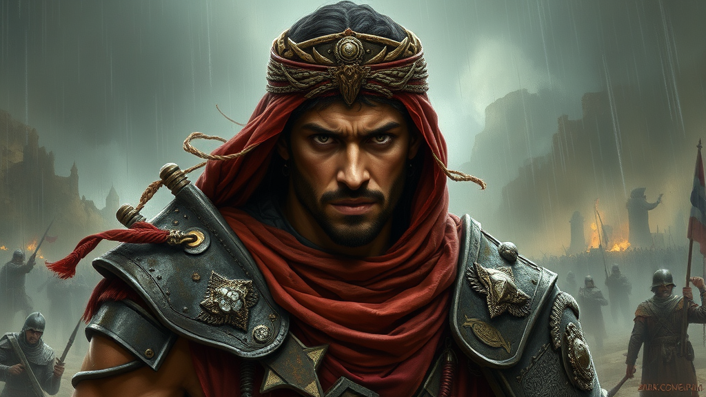 Portrait of a fierce Arabian warrior, set against a dramatic, rain-soaked backdrop, capturing a profound emotional intensity, with influences of symbaroum style, painted digitally. Inspired by the works of Martin Grip, Gustaf Ekelund, Jakub Rozalski, Bernie Wrightson, and Frank Frazetta. The warrior, clad in ornate, battle-worn armor, stands amidst the chaos of a stormy landscape, his eyes reflecting a lifetime of struggle and resilience, blending realism with mythic undertones.