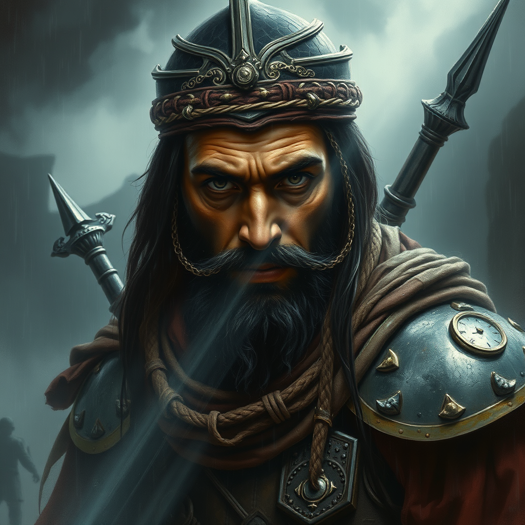 Portrait of a fierce Arabian warrior, shrouded in misty rain, set in an epic and emotionally charged scene, capturing the dark and mystical atmosphere of symbaroum. Digital painting inspired by the styles of Martin Grip, Gustaf Ekelund, Jakub Rozalski, Bernie Wrightson, and Frank Frazetta, highlighting a rugged, weather-beaten face and penetrating eyes, adorned with intricate armor and ancient weaponry, surrounded by a haunting landscape that enhances the warrior's formidable presence.