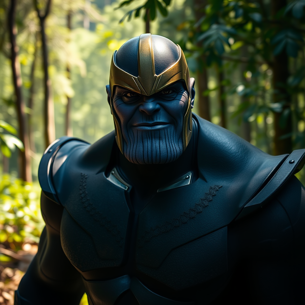 Portrait of a friendly Thanos in a lush forest in Himachal Pradesh, with clear facial features and a big, toned chest. Cinematic composition using a 20mm lens and f/1.8 aperture, enhanced by accent lighting and global illumination. Uplighting adds depth, set in a 16:9 aspect ratio, capturing a serene and majestic atmosphere.