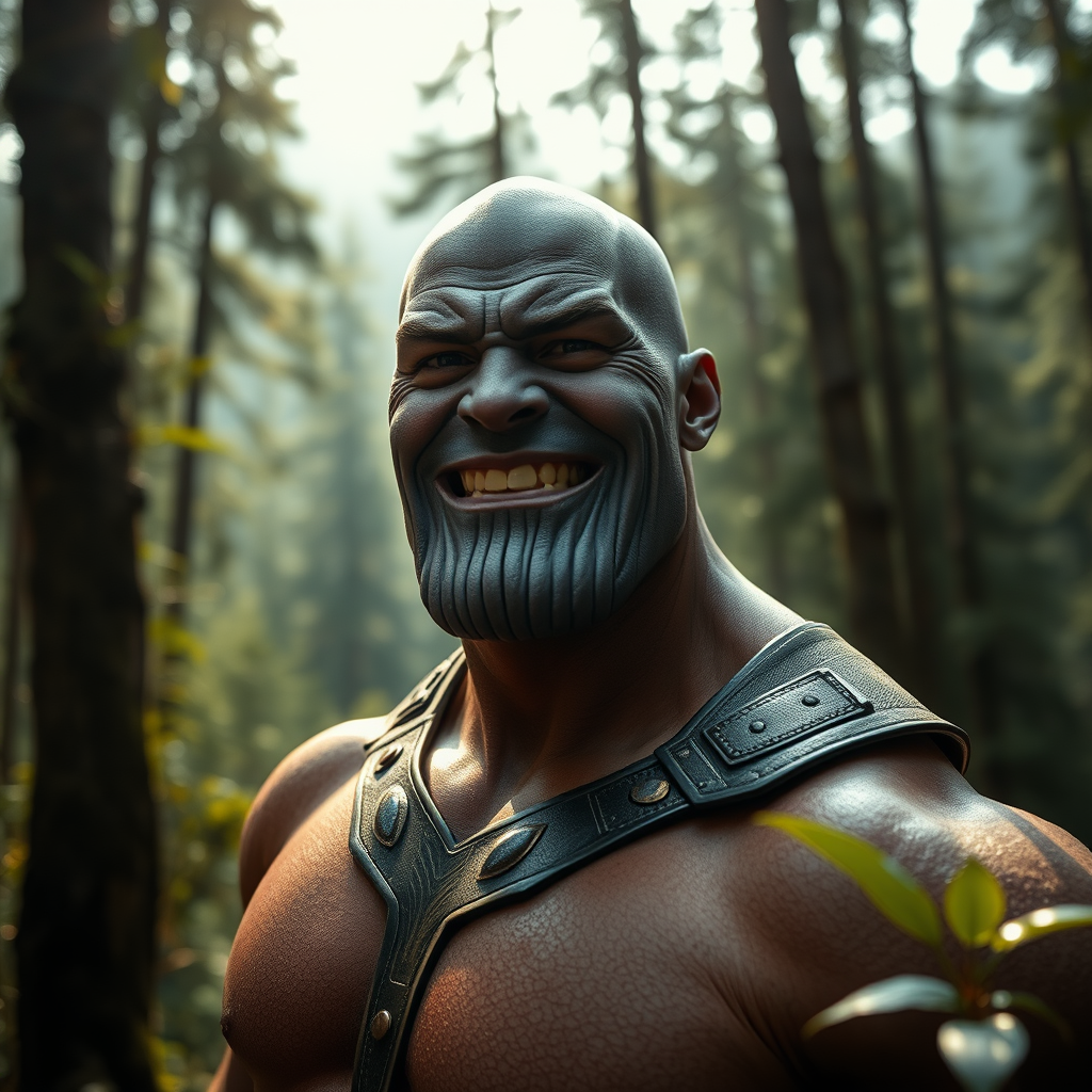 Portrait of a friendly Thanos in a lush forest of Himachal Pradesh, with clear facial features and a broad smile, showcasing a big chest and toned body. Cinematic feel captured with a 20mm lens at f/1.8 aperture, enhanced by accent lighting and soft global illumination, featuring a warm, natural uplight. The scene is set in a picturesque 16:9 aspect ratio, capturing the serene ambiance of the forest.
