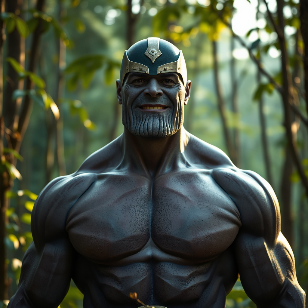 Portrait of a friendly Thanos with clear facial features in a lush forest of Himachal Pradesh, showcasing his big chest and toned body. Captured with a cinematic feel using a 20mm lens at f/1.8, the scene is enhanced by accent lighting and global illumination, creating a captivating ambiance in a panoramic 16:9 aspect ratio with soft uplight.