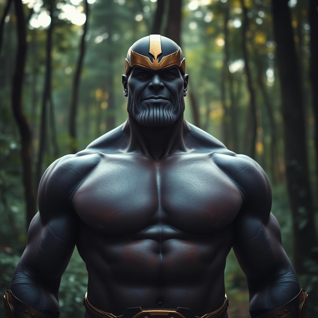 Portrait of a friendly Thanos with clear facial features, standing in a lush forest in Himachal Pradesh. He has a big chest and toned body, captured with a cinematic perspective using a 20mm lens at f/1.8. The scene is enhanced with accent lighting and global illumination, creating a dramatic uplight effect. The composition maintains a 16:9 aspect ratio for an immersive view.