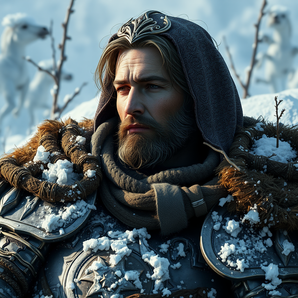 Portrait of a full male figure, cloaked in intricate armor, resting in a serene snow-laden landscape, reminiscent of Sturm from Dragonlance. A human knight of great honor, his expression is one of peaceful respite amidst the winter's embrace. His detailed face and eyes convey wisdom and integrity, captured with the artistry of Jeremy Mann, Sandra Chevrier, and Maciej Kuciara. The scene is crafted in 8k photorealistic detail, exhibiting sharpness and realism with authentic shadows and a 3D presence. Elements of the environment subtly enhance the mood, without deviating from the core essence of a majestic knight in tranquil repose. Model influence: RPG 4. Negative elements avoided: lowres, anatomical inaccuracies, beard, juvenile features, inappropriate attire, cartoonish styles, multiple horses.