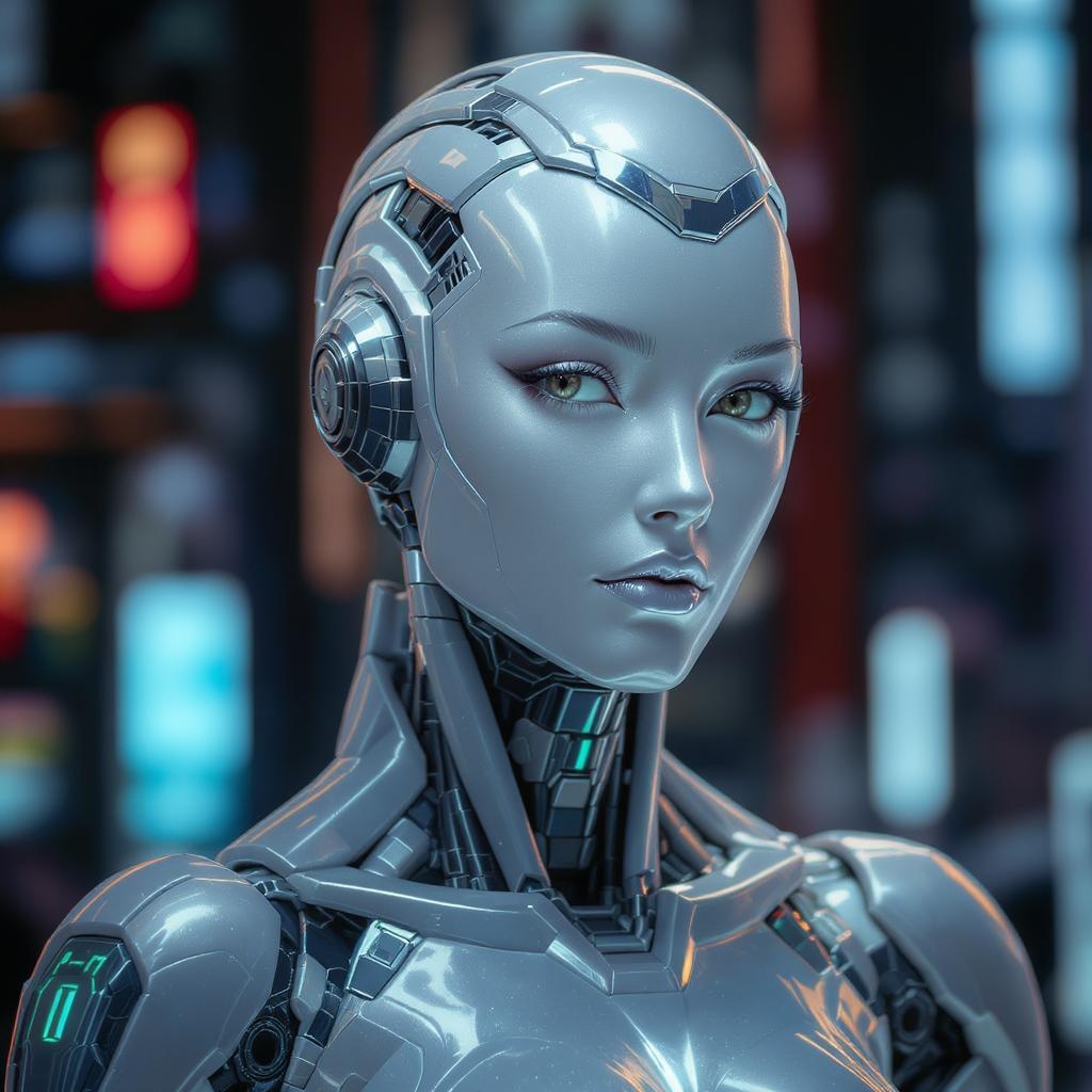 portrait of a futuristic android guard, female with sleek silver skin, intricate robotic details, wearing polished reflective armor, adorned with metallic plating and futuristic metal hair design, shot in high-definition clarity with an 80mm lens, capturing the scene with an f/1.8 aperture for striking depth of field and bokeh effects, evoking a sci-fi aesthetic with an emphasis on elegance and precision.