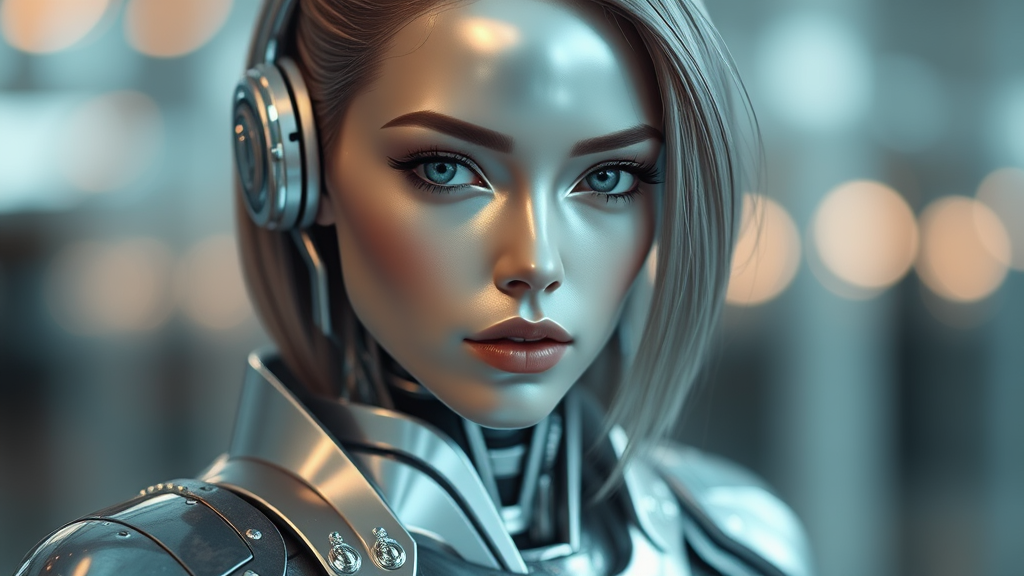 portrait of a futuristic guardian android girl, shimmering silver complexion, robotic and mechanical features, reflective armor with intricate metal plating, sleek metallic hair, captured with 85mm lens, f/1.8 aperture, showcasing soft depth of field and gentle bokeh, ethereal sci-fi ambiance with a hint of cyber elegance