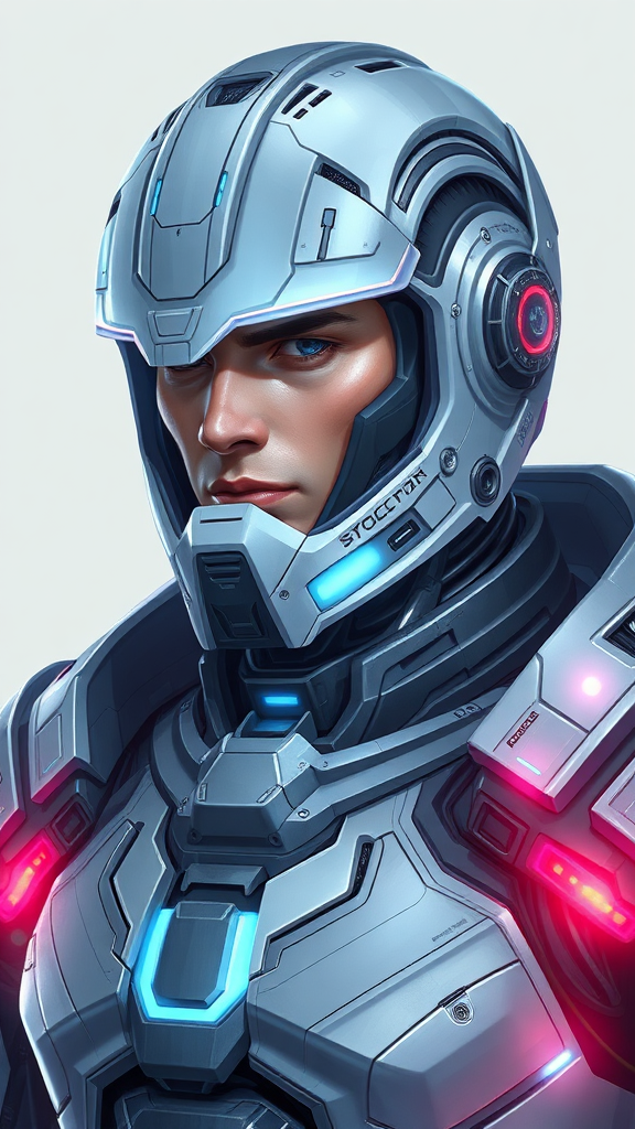 Portrait of a futuristic hero adorned in sophisticated, cybernetic armor and helmet, set in a sci-fi universe. His armor is intricate and glows with an ethereal light, covering his entire form elegantly. The composition is highly detailed, resembling digital paintings seen in concept art circles, with a smooth and sharply focused illustration style. Influences from Artgerm, Greg Rutkowski, and Alphonse Mucha imbue the piece with a unique artistic flair. The character is rendered with precision and compelling presence, capturing the essence of power and innovation in a seamless blend. The background is clear and complimentary, ensuring the hero remains the focal point. The work is devoid of any imperfections or visual errors, maintaining high-quality execution throughout the piece.