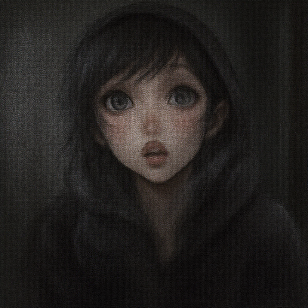 Portrait of a girl by a window, wearing a hoodie, with dynamic lighting casting dramatic shadows. She has an anime-inspired look in a comic art style, rendered in a rough digital painting. The colors are muted and the detailing is intricate, yet intentionally flawed: low resolution, jpeg artifacts, and designed imperfections such as distorted features, odd proportions, and missing or extra limbs. The composition appears blurry and deformed, with a long neck and awkward anatomy highlighted. Elements of cameras and signatures are subtly integrated into the background to create an impression of an unfinished or raw draft.
