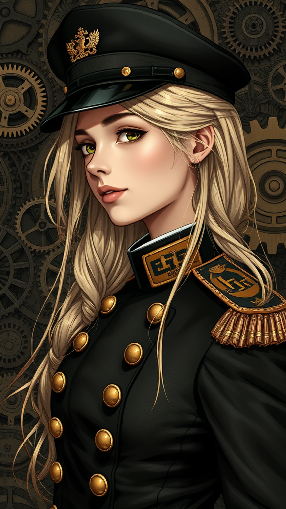 Portrait of a girl in a ceremonial officer's tunic, her loose blond hair cascading down, embodying a dieselpunk aristocrat with a model-esque face. The scene is richly detailed, featuring monograms subtly integrated into both her attire and the intricate background, filled with cogs and gears. The style captures the essence of Ian McQue, merging elements of the Russian and British empires with a unique blend of vintage and retro-futuristic aesthetics. The digital painting is rendered with max detailing, emphasizing realism and a side view perspective, using dark colors to enhance the mood. The scene is set in 8k resolution, showcasing intricate craftsmanship and anime art influences.