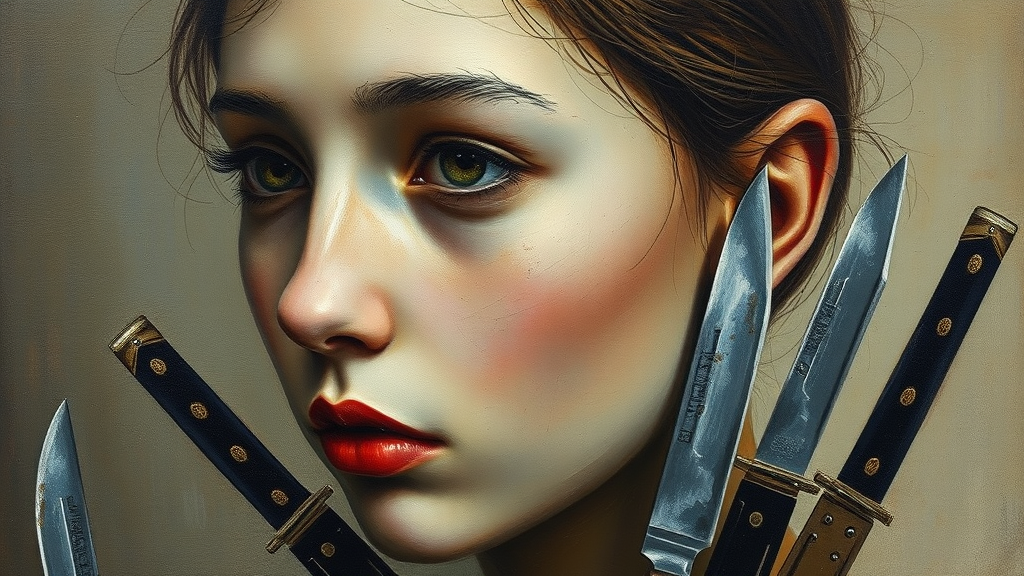Portrait of a girl in an oil painting with a right face composition, her eyes empty yet compelling, holding a distant gaze. The artwork bears a grainy texture and minimalist avant-garde approach with intricate detailing. Influenced by the style of Diego Velazquez, the scene features numerous knives subtly intertwined within the composition, imparting a raw, rough quality.