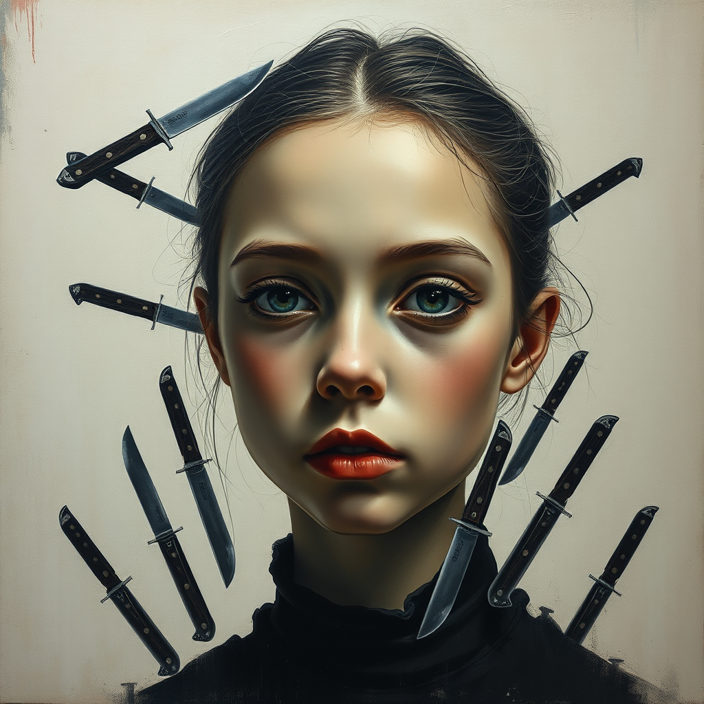 Portrait of a girl set against a minimalist avant-garde backdrop, captured in an artistic oil painting style. Her face, hauntingly beautiful, features empty eyes that convey a deep, dark mood. The grainy texture adds depth to the canvas, with rich detailing that draws you in. A multitude of knives appear subtly integrated into the composition, enhancing the rough, edgy atmosphere. The overall effect is raw yet captivating, maintaining a sense of mystery and intrigue.