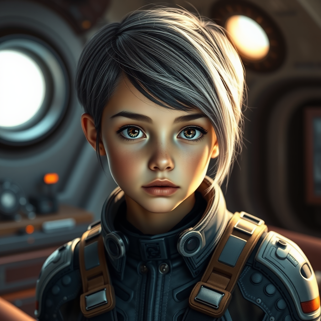 Portrait of a girl with expressive, deep eyes and a stunning face, capturing an air of innocence and beauty. She has a chic haircut with her hair in a unique color, wearing a fitted jumpsuit crafted from advanced science fiction materials featuring futuristic elements. The backdrop is a sci-fi themed room, rendered in stunning quality and ultra-high resolution with photorealistic detail. The lighting is reminiscent of Rembrandt's technique, highlighting her features. The portrayal is devoid of any distortions, maintaining proper anatomy and proportions, ensuring clarity and detail without any artifacts or imperfections. The scene is lively yet subtly lit, with circular windows adding a touch of natural light and ambiance.
