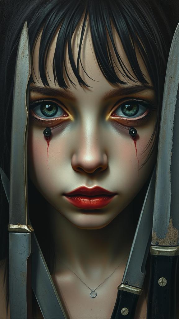 Portrait of a girl with hollow eyes, depicted in an artistic oil painting. The face is rendered with a minimalist avant-garde approach, showcasing rich detailing and a grainy texture. The composition includes numerous knives, adding to the rough, dark ambiance. The aspect ratio is elongated at 9:16, emphasizing the figure's verticality. The overall mood is intense and raw, with subtle creative enhancements that maintain the core concept's depth and intrigue.