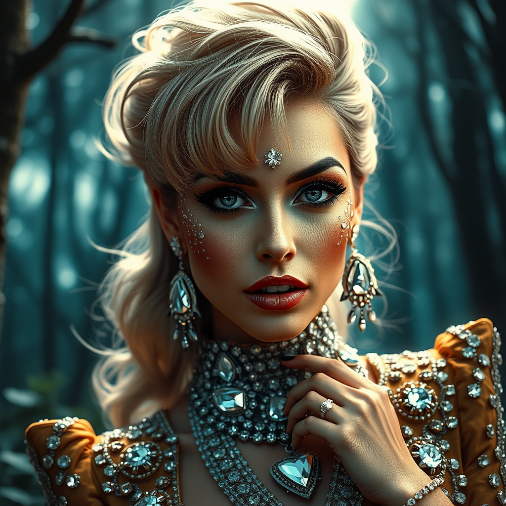 Portrait of a glamorous rock star adorned in exquisite jewel-encrusted attire, their face finely detailed, reminiscent of a magazine cover, set against a mystical enchanted forest backdrop; artwork inspired by David LaChapelle, bathed in soft moonlight, showcasing intricate details, captured in ultra-high definition, with an intimate close-up focus.