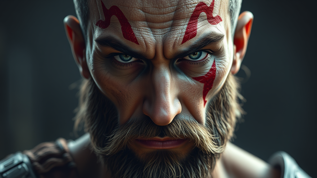 Portrait of a god of war, close-up view, gazing forward with intense focus, clean-shaven revealing intricate facial details, a serious expression, capturing upper body, head, and shoulders in an 8k resolution concept art style. Inspired by dmc_kay, WLOP, features dynamic and volumetric lighting with hyperdetailed and intricately layered textures. The composition includes a striking triadic color scheme, creating an engaging and artfully splashy appearance. Art is trending with remarkable depth and a touch of ethereal ambiance.