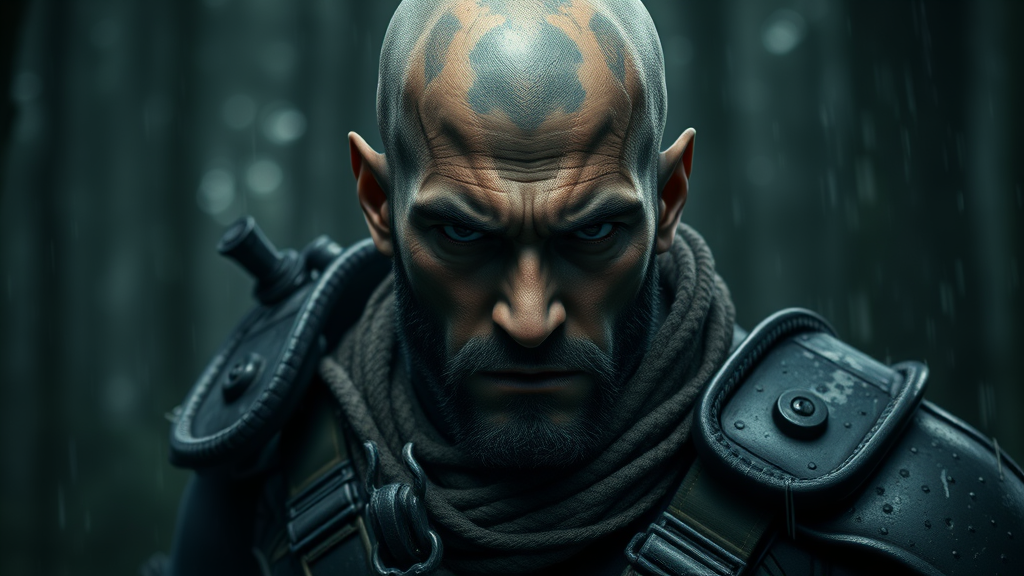 Portrait of a grizzled young ranger with a cold stare, bald and angry, wearing rugged armor, set against a forest backdrop. The composition uses dark colors, with sharp and highly detailed features. The scene is a full-body, dynamic action shot in 8k unity render, capturing realistic hands and skin pores. The atmosphere is dark, with heavy shadows and very detailed facial features, invoking a decadent and majestic environment. The digital artwork, influenced by artists like Artgerm, WLOP, Ilya Kuvshinov, Greg Rutkowski, and Alphonse Mucha, embodies a smooth yet sharp focus. Heavy rain and floating particles drift through the dim light, enhanced with two-tone lighting to cast trim light over facial markings. The ranger's attire includes blue jeans, contributing to the modern twist. The aesthetic, resembling a 3D render with an illustration quality, avoids malformed elements, ensuring symmetry, correct proportions, and clarity while maintaining a monochrome backdrop. The art blends dynamic energy with a smooth, high-resolution finish, void of distortion, watermarks, or low-quality artifacts.