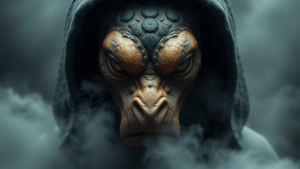 Portrait of a guardian creature, embodying themes of pause, retreat, and caution, with an intense, front-facing gaze set in sharp focus. Enveloped in a mystical cloak of volumetric fog, the highly detailed visage exhibits symmetrical features, conveying an aura of vigilant watchfulness and balance, as if standing at the threshold of decision and direction.