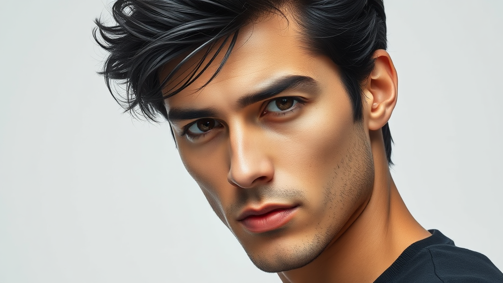 Portrait of a handsome man with dark black hair in a dynamic composition. The focus is on a clear, detailed depiction, capturing the essence and expression of the subject. The background is simple, emphasizing the man's features, and avoiding distractions. The image maintains high quality, avoiding errors such as low resolution, poor anatomy, or disfigurement. The emphasis is on realism and accuracy without any surreal or exaggerated elements, achieving a clean, refined portrayal free from any visual artifacts or distortions.