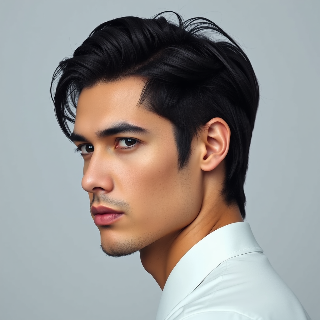 Portrait of a handsome man with striking dark black hair, capturing a dynamic composition. Focus on emphasizing clarity and high quality, avoiding any visual distortions, disfigurements, or low-resolution effects. The portrait should present a side view to highlight the man's features, ensuring a refined and sophisticated appearance. Additionally, maintain a realistic tone without surreal or exaggerated elements, avoiding any inclusion of additional subjects or distracting details.