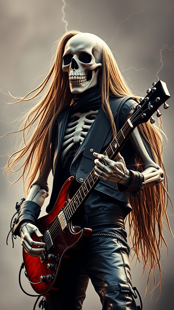Portrait of a Heavy Metal Hero: A skeleton-faced figure adorned in rugged leather attire, exuding an aura of rebellion and power. Long, flowing hair cascades down their back, framing their bony visage. This rock legend stands poised, guitar in hand, as electric currents of energy seem to surge from their fingertips, embodying the spirit of metal.