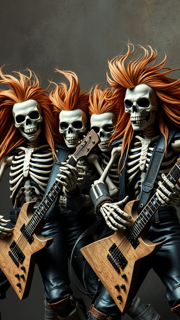 Portrait of a Heavy Metal Legend: four heroic skeleton figures adorned in rugged leather attire with flowing, lavish hair, exuding a rebellious spirit and striking dynamic poses as they clutch their guitars with fierce intensity.