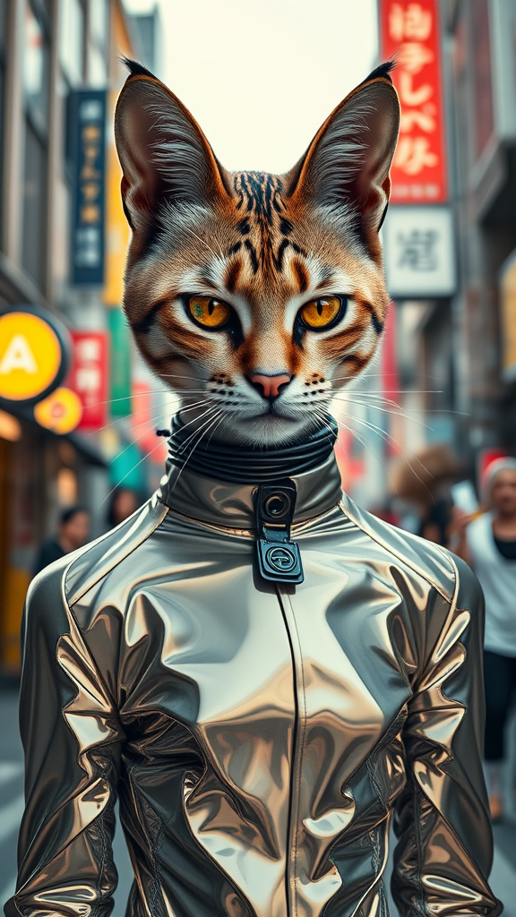 Portrait of a humanoid feline dressed in avant-garde Mugler couture in a vibrant Tokyo setting, high-fashion photography, rendered with octane for hyper-realistic detail, 8k resolution, utilizing natural light, incorporating a surreal pop art element, subtle color tones and dynamic urban backdrop for a unique visual fusion.