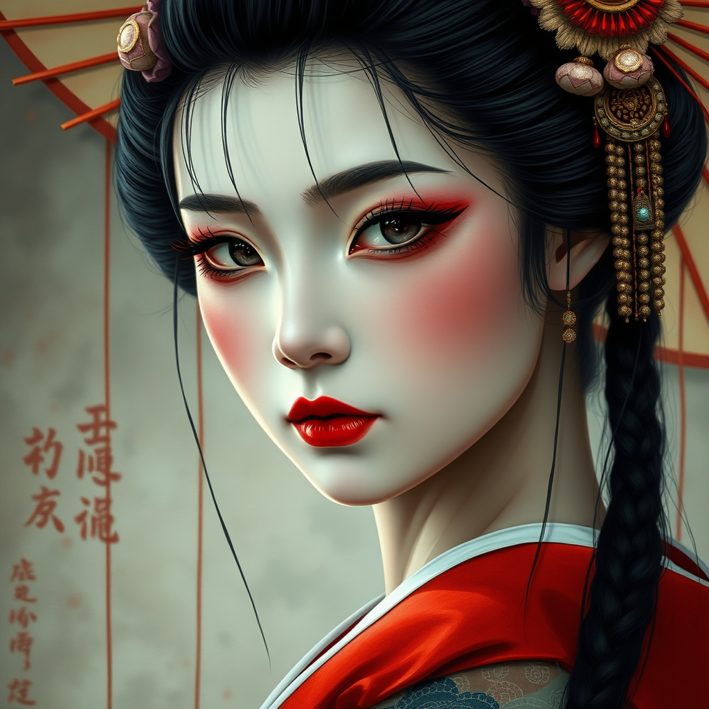 Portrait of a Japanese black-haired geisha, her expression infused with a melancholic aura, artfully draped in dripping colors. The scene is vibrant yet evocative, showcasing intricate details in an elegant, hypermaximalist style. The artwork is exceptionally detailed, with Super-Resolution clarity that captures every nuance in megapixel precision. An epic, hyper-realistic representation, merging traditional elegance with a modern, expressive twist.