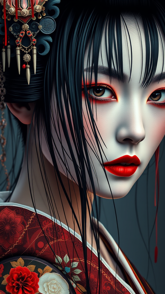 Portrait of a Japanese black-haired geisha with a somber expression, rendered in a dripping art style with vibrant colors. Impeccably detailed and elegantly composed, the image is hypermaximalist and showcases exquisite intricacy. Captured in super-resolution and megapixel quality, the scene is epic and hyper-realistic, exuding a sense of deep emotion and artistry.