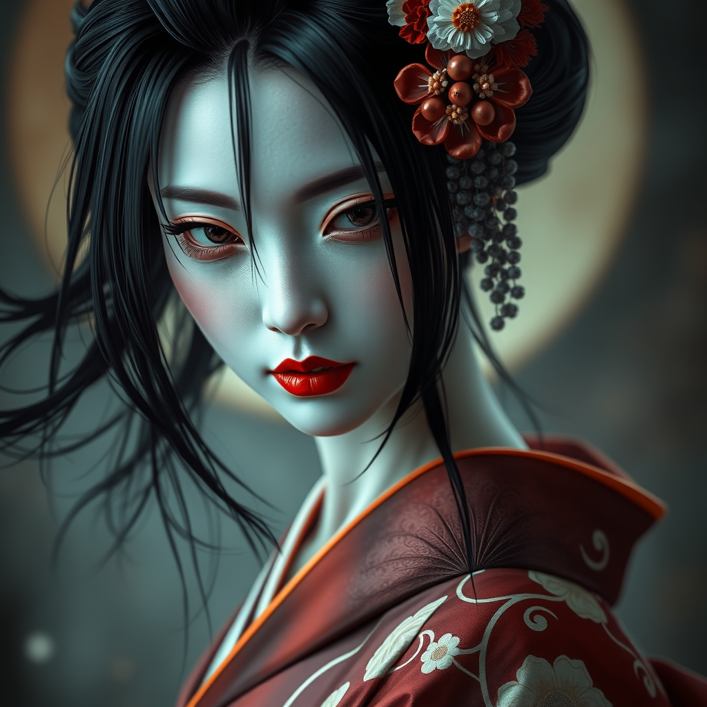 Portrait of a Japanese geisha with flowing black hair and a melancholic expression, rendered in a dripping art style. The image is vibrant and richly detailed, showcasing an elegant and hypermaximalist approach. The scene is magnified with stunning super-resolution and megapixel clarity, presenting an epic and hyper-realistic depiction with subtle creative nuances that enhance the atmosphere and emotion.
