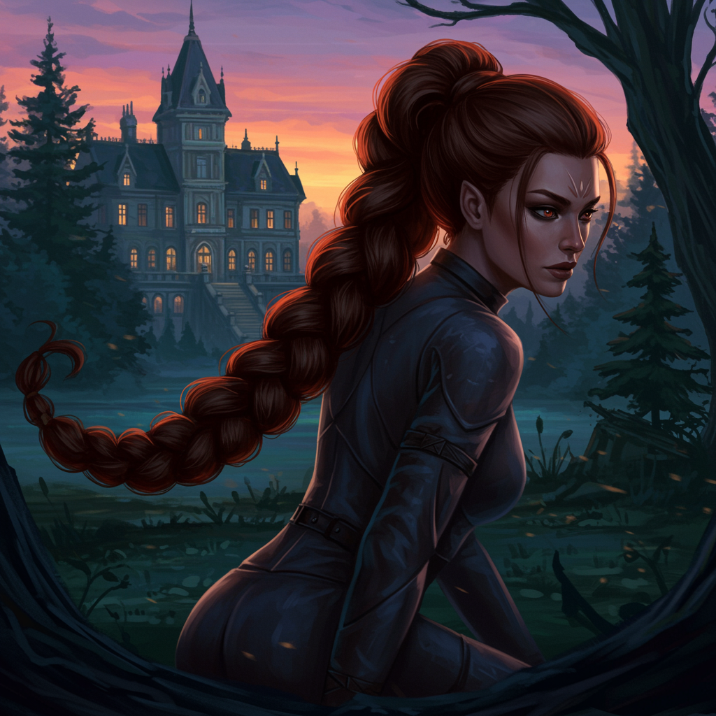 Portrait of a Lumberjack woman with an exquisite, voluminous braid, adorned in a sleek, form-fitting outfit, captured in an intricate and dynamic pose. The scene is painted in oil with an ancient allure, illuminated by the enchanting glow of twilight. Behind her looms an impressive, timeworn mansion nestled at the edge of an ancient, mystical forest. The atmosphere exudes an air of mystery and brilliance, crafted with the artistic finesse reminiscent of Allan Jabbar, Yann Dalon, Toni Infante, and Amr Elshamy.