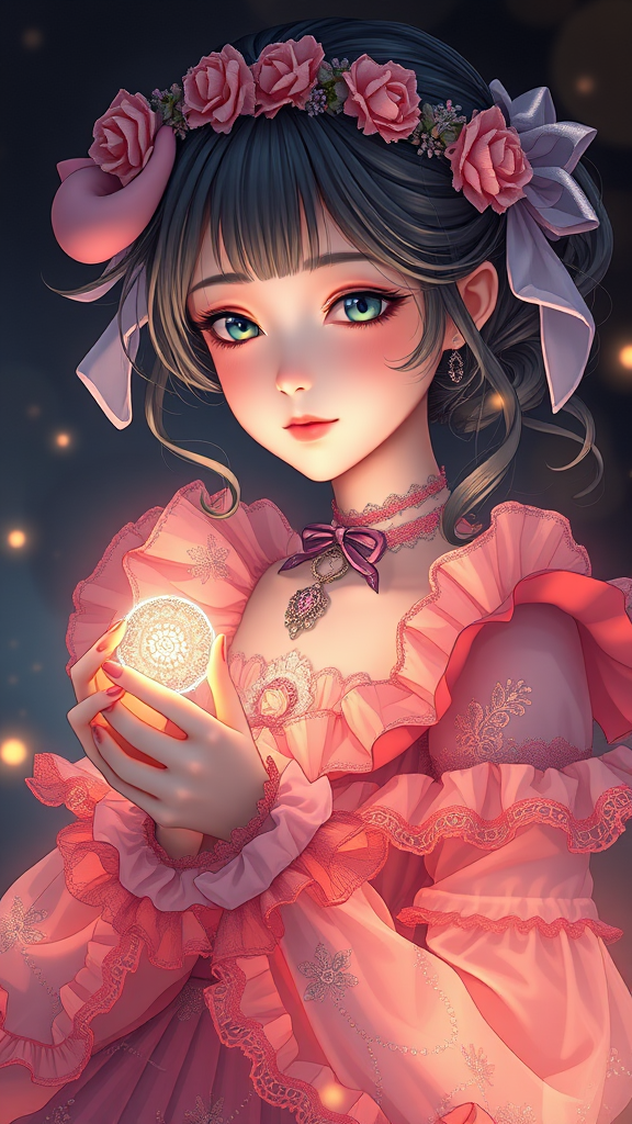 Portrait of a magical Lolita girl, dreamy and ethereal with a peaceful expression, wearing an ornate frilly dress imbued with fantasy elements. The scene captures an elegant and highly detailed illustration with a focus on intricate details and vivid colors. The girl holds a delicate object in her hand, surrounded by glow effects in a dark, atmospheric setting that evokes a cinematic, sensual feeling. The image is rendered with sharp focus, depth of field, and dramatic lighting, showcasing hyperrealistic textures, especially on the skin and pupils. A professional greeting card aesthetic, with a majestic and high-quality finish, trending on ArtStation and CGSociety. The composition is shot in 8k UHD HDR, reflecting the RAW candid cinema style, with a smooth animation quality inspired by the model ReV Animated.