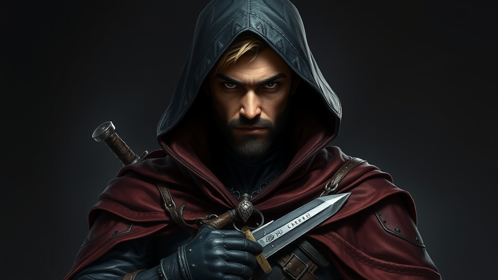 Portrait of a male rogue, stunning character, award-winning image, incredibly detailed, ultra-high resolution 16k, masterpiece artwork, full-body reference sheet, RPG style, fantasy theme, perfectly symmetrical features, Dungeons & Dragons inspired, captivating and mysterious aura, expertly crafted design, cloak and dagger outfit, intricate leather armor, dark and shadowy background, sharp and cunning expression, adventure-ready posture.