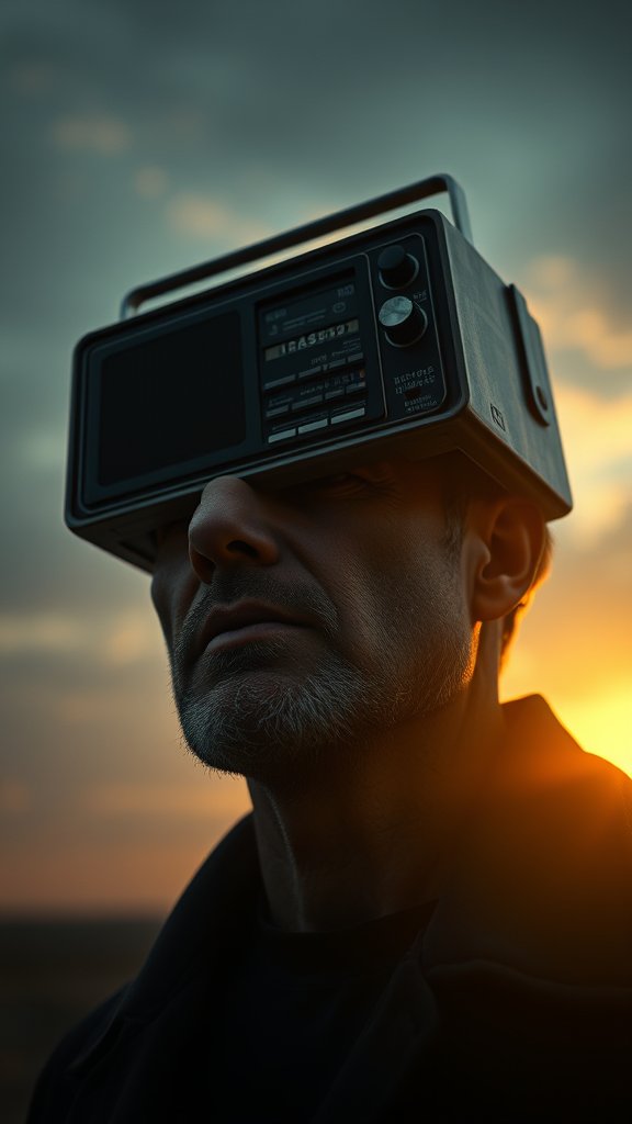 Portrait of a man with an old radio for a head, dramatic shadows, soft dawn light, cinematic ambiance, low-angle perspective, 4k ultra-realistic, sharp clarity, detailed textures, rendered in Unreal Engine 5, masterpiece art, inspired by Miyazaki's enchanting style and John Constable's intricate landscapes, evocative and mesmerizing artwork.
