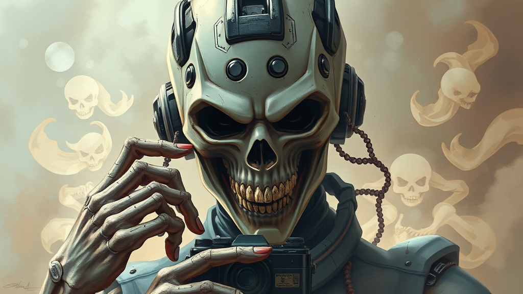 Portrait of a masked supervillain with a skeletal visage, exuding an aura of brutality and techno-futurism, captured in light colors amidst swirling smoke. The image, inspired by anime and comic styles, boasts an epic composition and dramatic flair indicative of a digital painting. It's characterized by intricate details and muted colors, yet intentionally marred by visual flaws: pixelation, jpeg artifacts, and signs of amateurish execution with poorly drawn hands and face. The villain's form is distorted by mutations and disfigurations, with malformed limbs and gross proportions. Anatomy is flawed with a long neck, asymmetrical features, and a perplexing count of extra or missing limbs. The composition further compromises with haphazard integration of elements like a camera and a distorted signature, while unwanted artifacts like watermarks and logos intrude upon the chaotic yet compelling visualization.