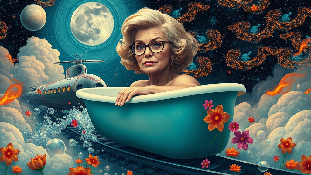 portrait of a mature woman, atompunk style, reminiscent of Iulje's artistic flair blended with elements of Pokimane, set in a surreal scene featuring a bathtub transformed into a boat traversing a train-like track, alongside a submarine navigating through bubbles and clouds. Envision a cosmic backdrop with hints of space and milky galaxy themes, infused with swirling fire patterns, speckled with polka dots and vibrant flowers.