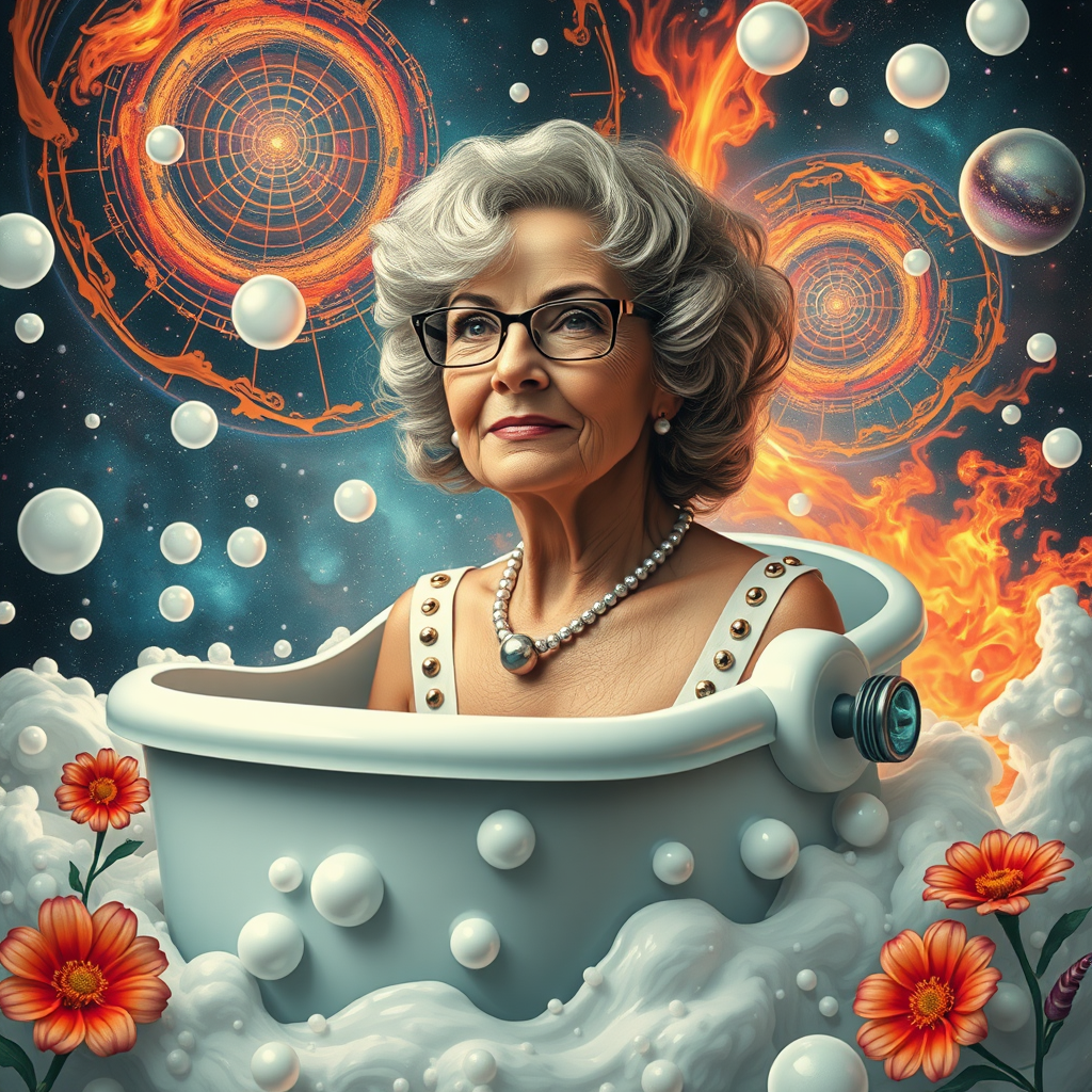 Portrait of a mature woman in an atompunk style, blending elements of a futuristic train and submarine, with her surroundings filled with bubbles and clouds. She's depicted in a bathtub-like boat, navigating through a cosmos where galaxies swirl in fiery patterns. The scene features polka dots and vibrant flowers, adding a whimsical touch. The atmosphere is a fusion of space and mythical realms, where elements of space, milk, and fire coexist in a lively, surreal tableau.