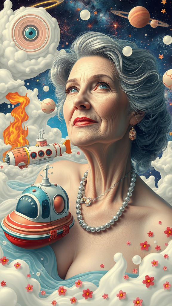 Portrait of a mature woman in atompunk style, blending elements of Pokimane with a surreal setting involving a bathtub boat and train-submarine combination, surrounded by bubbles and clouds. The scene is a whimsical fusion of space themes with milk rivers and galaxy patterns, accented by swirling flames. The composition is enhanced with a touch of magic-like polka dots and scattered flowers, creating a dreamy, ethereal atmosphere.