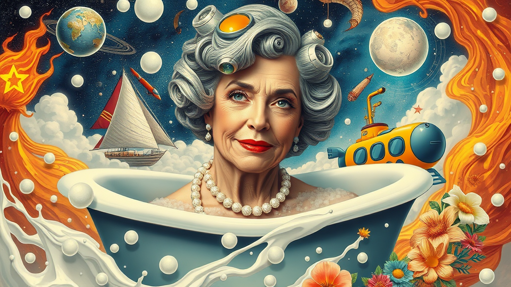 Portrait of a mature woman in atompunk style, featuring elements like a bathtub, boat, train, and submarine. Surround her with whimsical bubbles, fluffy clouds, and a cosmic backdrop of space and galaxy themes. Envelop the scene in a swirl of milk and fire, incorporating imaginative polka dots and vibrant flowers, evoking a sense of style-swirlmagic and style-paintmagic.