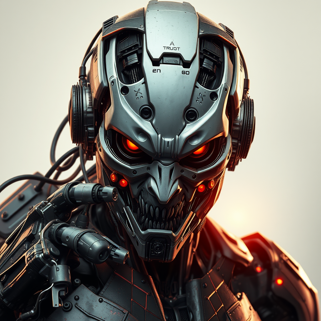 Portrait of a menacing cyborg, exuding ominous energy, with intricately crafted mechanical features and subtle, hidden details. Set in a dynamic pose, the hyper-realistic design captures a balance between advanced robotics and sinister intent. Enhanced with high dynamic range and meticulous attention to detail, the cyborg embodies both futuristic technology and an eerie, lifelike presence. The style accentuates the complex interplay of light and shadow, revealing the sophisticated intricacies of its construction.