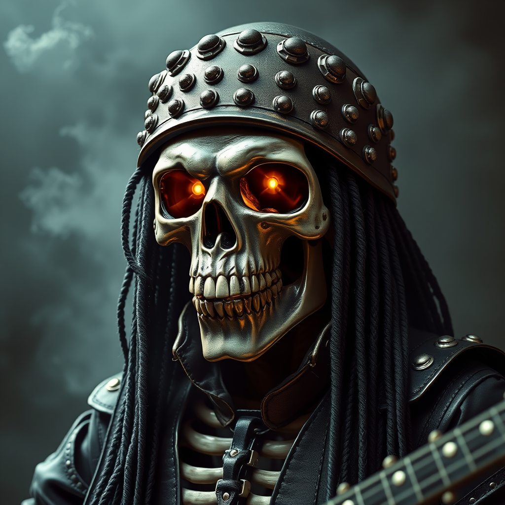 Portrait of a Metal Guitar: a heroic skeleton face adorned with studded leather attire, cascading obsidian locks flowing down, eyes glowing with an ethereal light, surrounded by an aura of mystic fog and silver chains, evoking the fierce spirit of a rock legend.