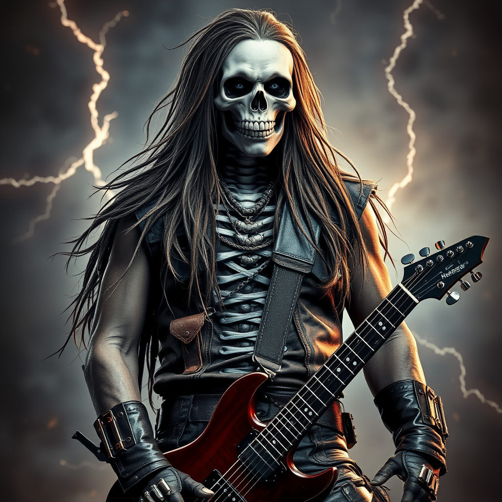 Portrait of a Metal Guitar Icon: A formidable skeleton-faced hero adorned in rugged leather attire, with cascading locks of hair that reach beyond the shoulders, exuding a mystical aura. The character stands amidst an electrifying backdrop, embodying the spirit of heavy metal with a dramatic stance and intense gaze, capturing the essence of raw energy and rebellion.
