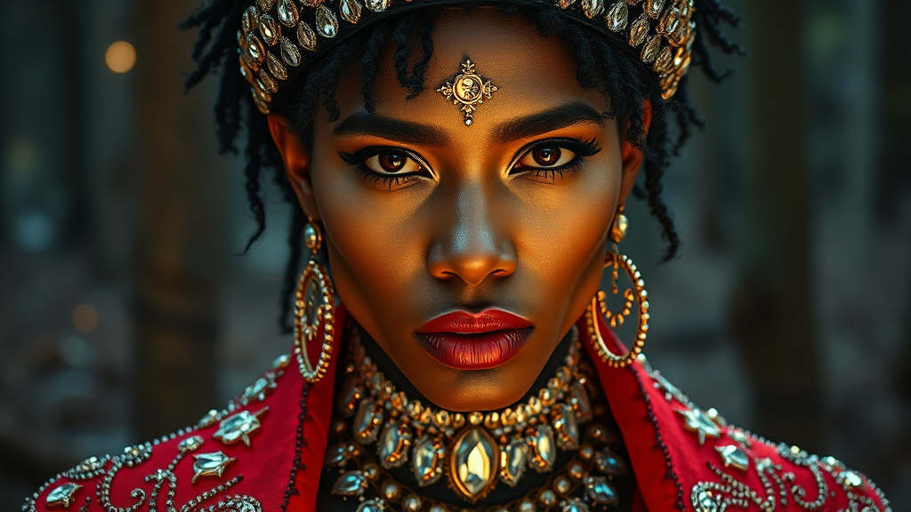 Portrait of a music icon adorned in luxurious gemstone-studded attire, intricate facial features, set against a mystical woodland backdrop, art styled by David LaChapelle, ambient low light with hints of silver moonlight, highly detailed rendering, ultra-high-definition, compelling close-up composition.