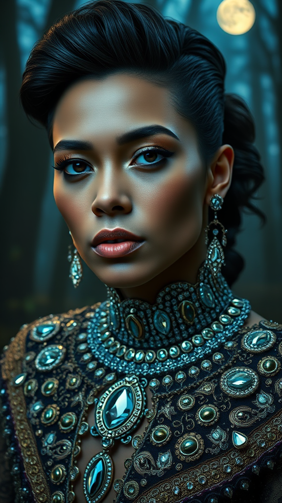 Portrait of a music icon adorned in opulent jewel-studded attire, striking facial features, set against a mystical woodland backdrop, art style reminiscent of David LaChapelle, illuminated by soft moonlight, exquisitely detailed, ultra-high definition, intimate close-up perspective