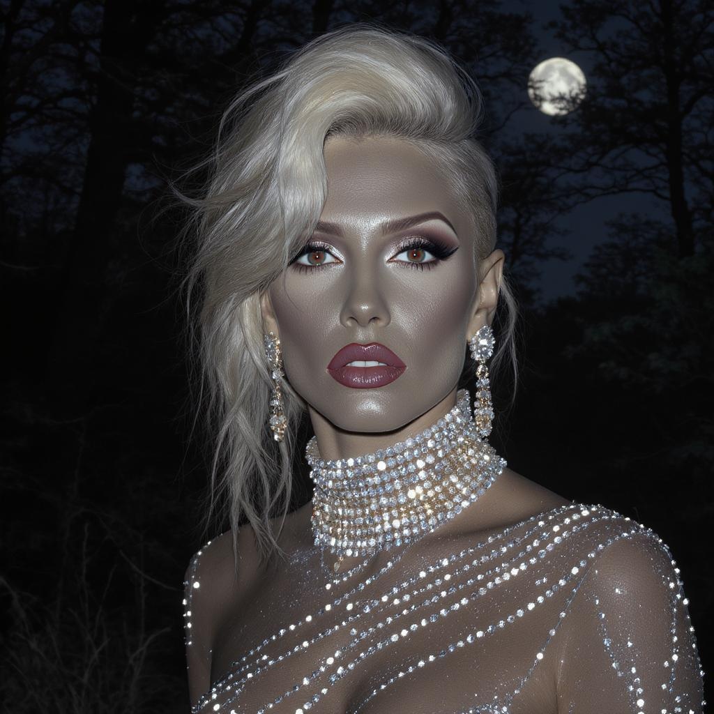 Portrait of a music icon draped in crystal-studded attire, intricately sculpted face, styled in the fashion of a glossy magazine, set against an enchanting woodland backdrop, art inspired by David LaChapelle, dimly lit ambiance, bathed in silvery moonlight, ultra-detailed, 8k resolution, intimate close-up.